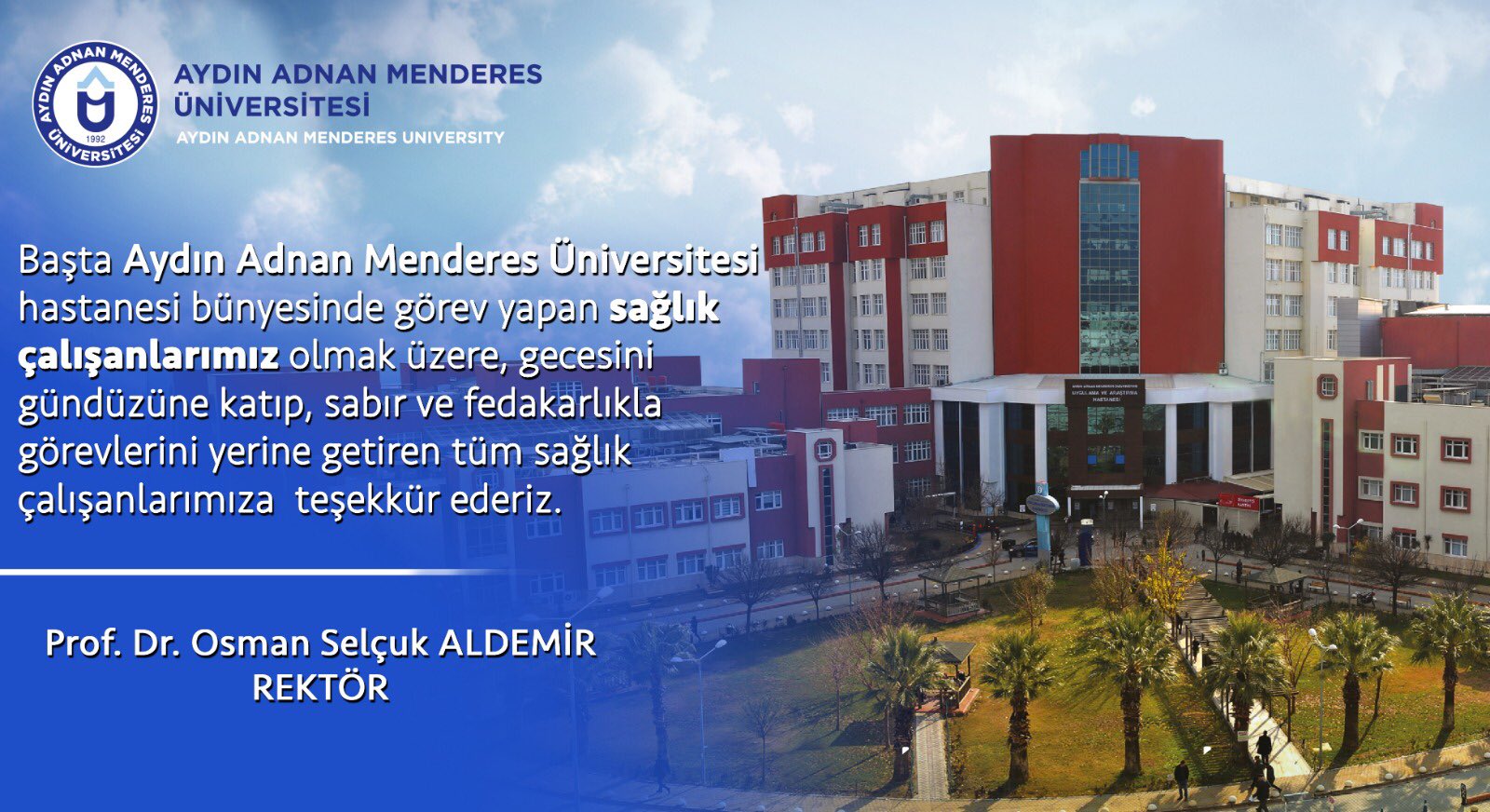 Aydin Adnan Menderes Universitesi On Twitter Basta Adu Hastanesi Bunyesinde Gorev Yapan Saglik Calisanlarimiz Olmak Uzere Gecesini Gunduzune Katip Sabir Ve Fedakarlikla Gorevlerini Yerine Getiren Tum Saglik Calisanlarimiza Tesekkur Ederiz Prof Dr